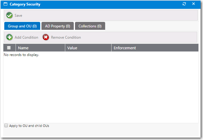 - Use the Add Condition button to open the Add Condition Dialog Box and add conditions to control access to the reports in this category.