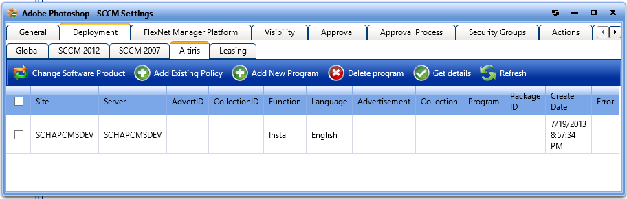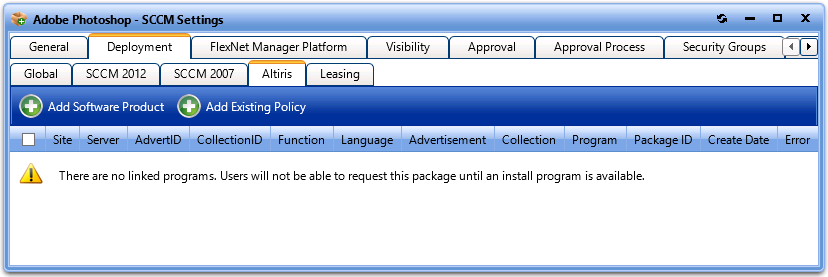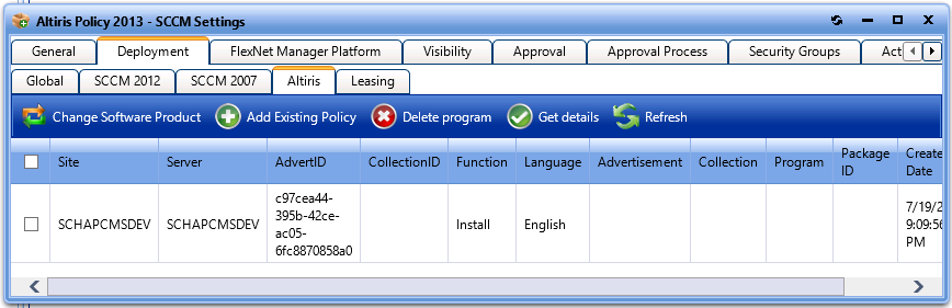 - Click Add Program . The policy is now listed on the Deployment > Altiris tab.