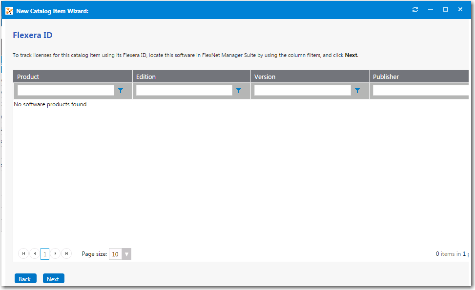 - When you are finished editing the fields on the Catalog Item Title and Category panel, click Next . If you are connected to FlexNet Manager Suite via the Flexera Service Gateway, the Flexera ID panel opens.