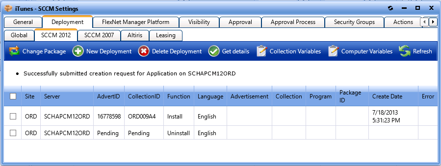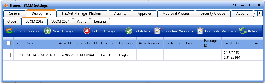 - Open the Deployment > SCCM 2012 subtab that contains the catalog item’s associated application or package.