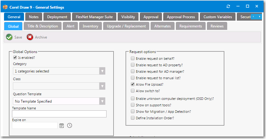 If a catalog item has the Allow File Upload? option selected on the General > Global tab of the Catalog Item Properties dialog box, which enables a user to upload a file during checkout, the Install Now button is not displayed.
