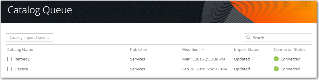 - Double click on Flexera . The Entire Catalog tab of the Flexera page opens, and the Last Import column of the catalog item lists the time period since the import (such as 5 minutes) and the Status column is changed to Configured .