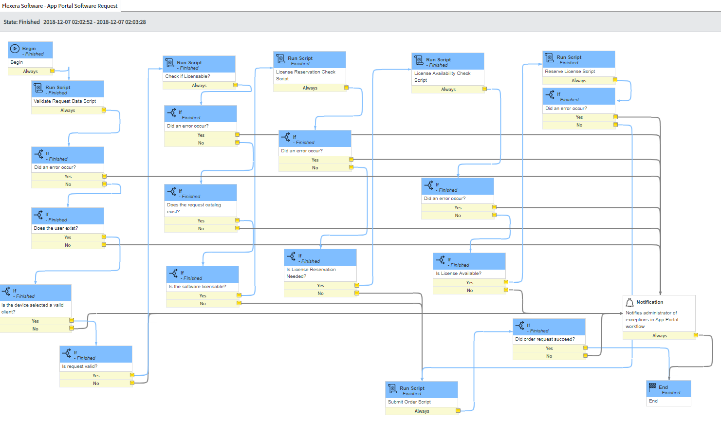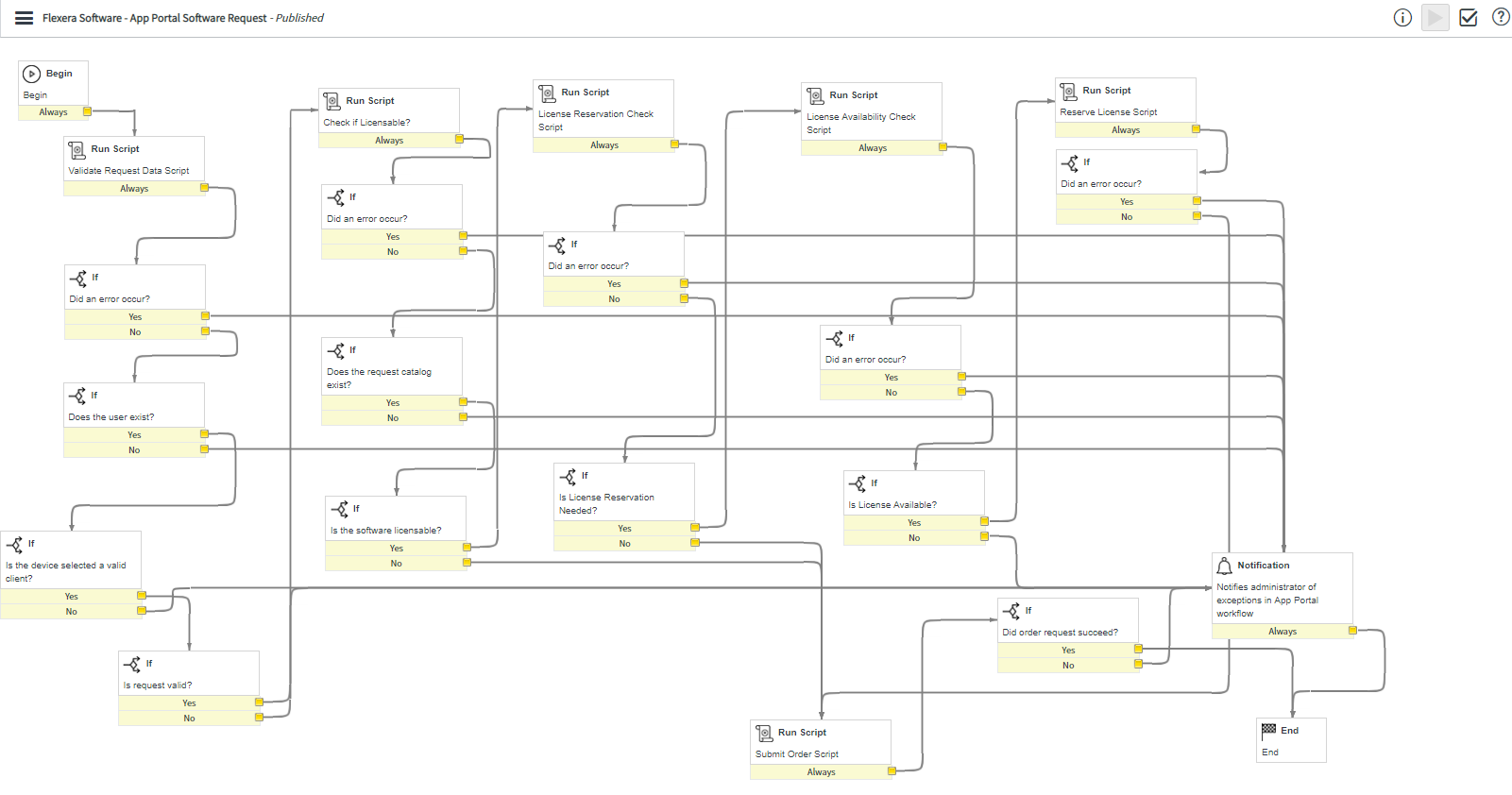 This Flexera Software - App Portal Software Request workflow enables ServiceNow to perform advanced license checks, reserve available licenses, and perform automated software delivery to multiple device types.