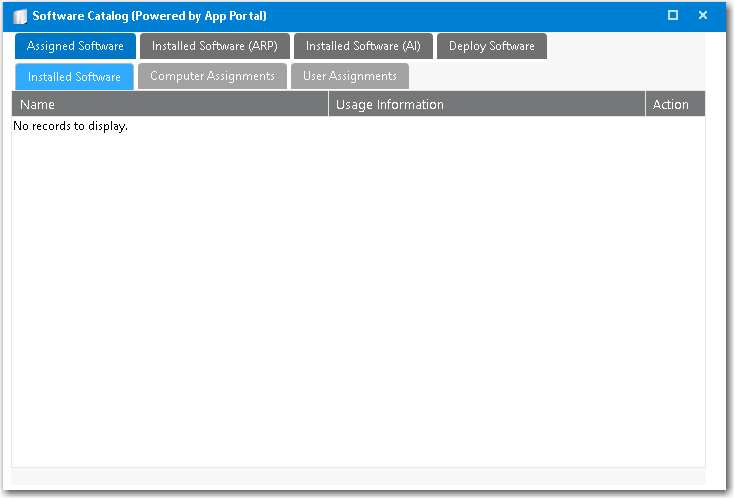- On the three subtabs of the Assigned Software tab, view information regarding installed software, computer assignments, and user assignments. This information is obtained from SCCM Inventory.