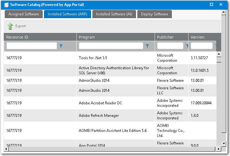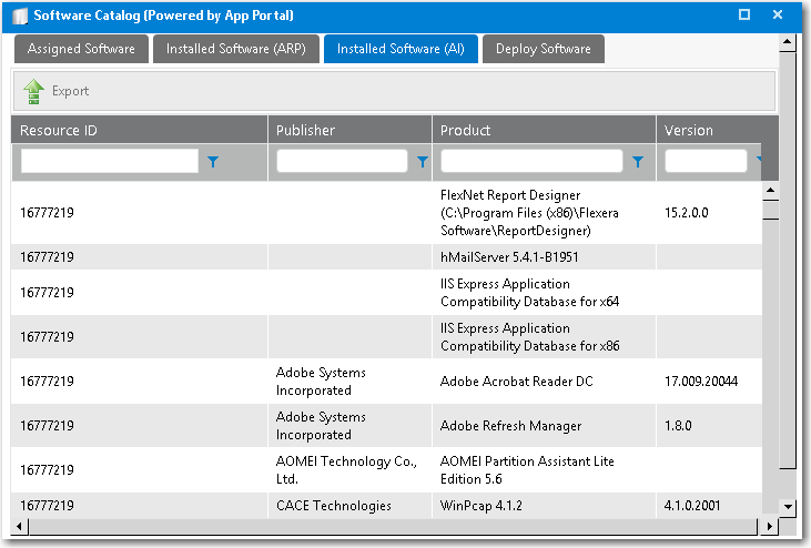 - On the Installed Software (AI) tab, view a list of software that was installed automatically. This information is obtained from SCCM Inventory.
