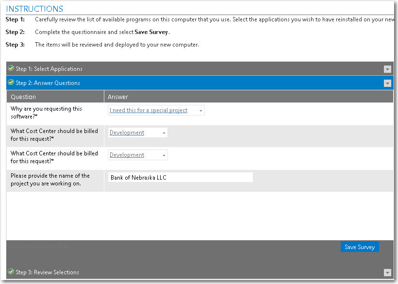 - Answer the displayed questions and click Save Survey . The survey responses are saved and the Review Selections panel opens, listing the user’s selections.