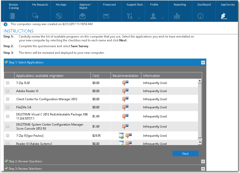 On the App Survey tab, users are prompted to identify which applications they want to have redeployed onto a new computer during OS deployment.