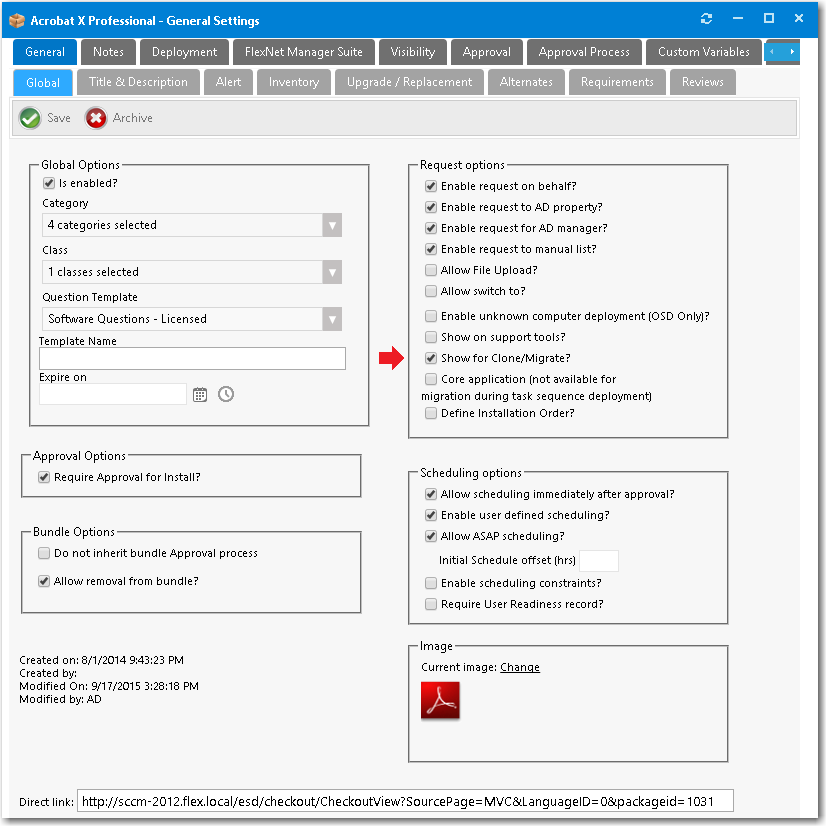 - Open the General > Global tab of the Catalog Item Properties dialog box for the software catalog item.