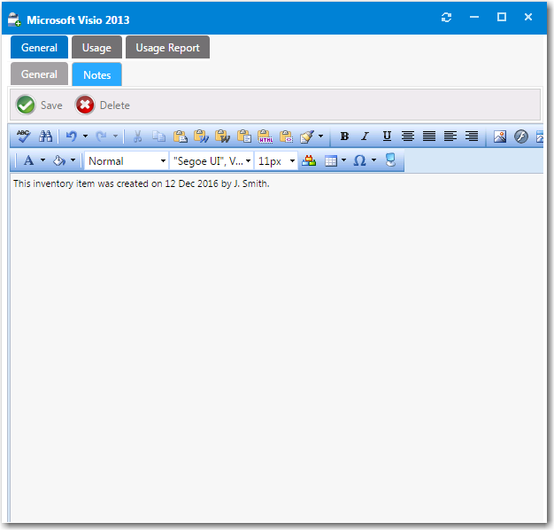 - To optionally enter associated information about what the inventory item will be used for, open the General > Notes tab and enter a note.