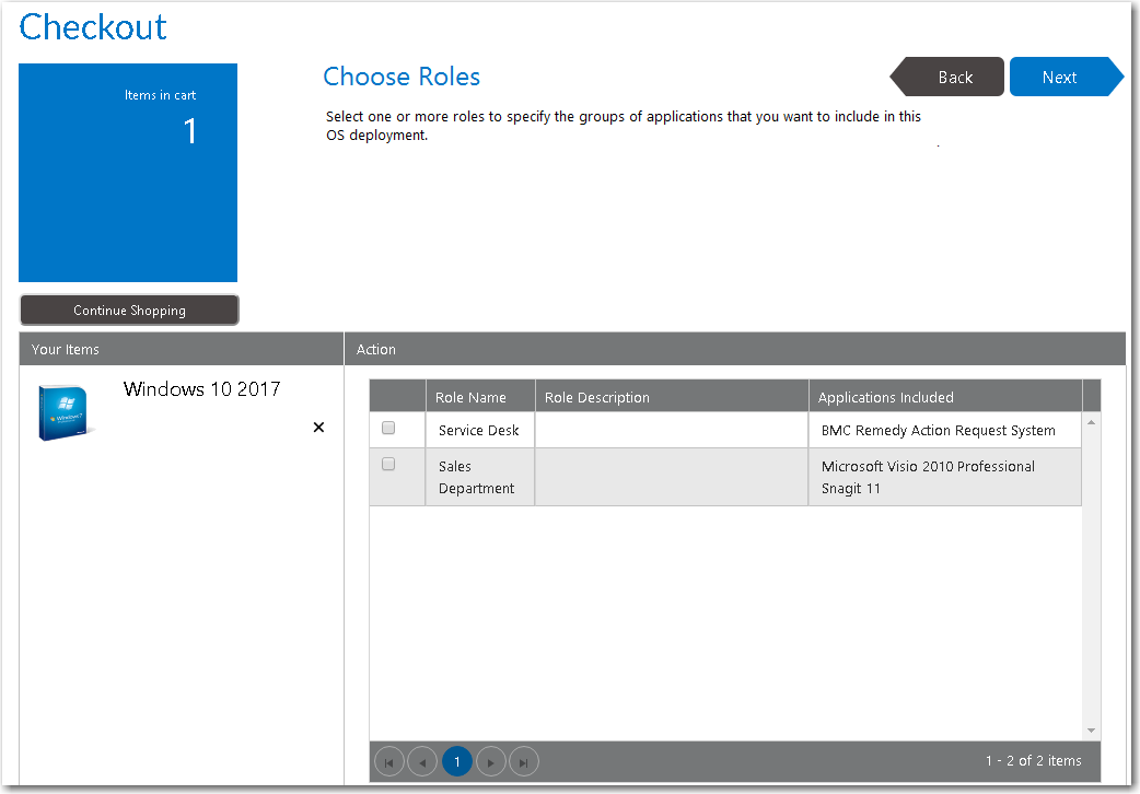 - On the Browse Catalog tab, locate an OS deployment task sequence catalog item, and click Add to add it to your cart. The Choose Target panel of the Checkout Wizard opens.
